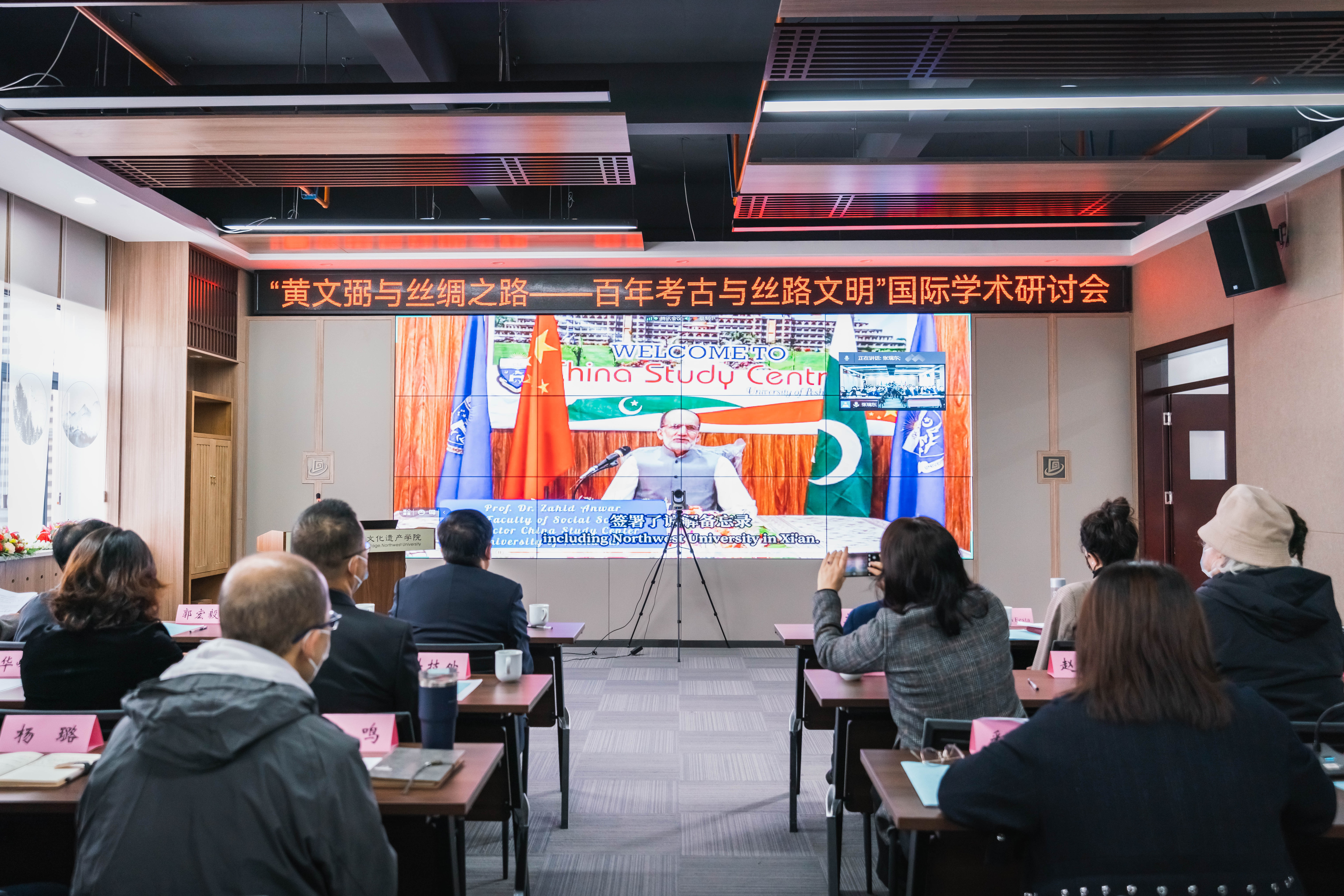 丝绸之路文化遗产保护与传承联盟代表、巴基斯坦白沙瓦大学中国研究中心主任、社会科学学院院长扎希德教授在线上致辞,对西北大学与巴基斯坦开展考古、文物保护与修复、文化遗产管理三个方向的合作表示欢迎。