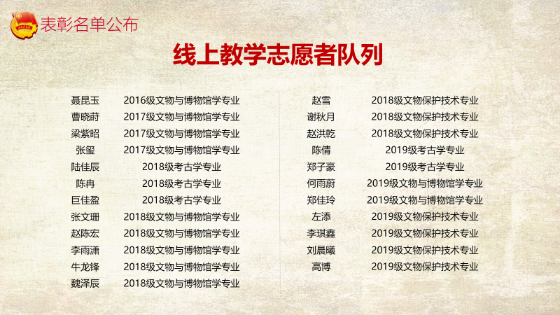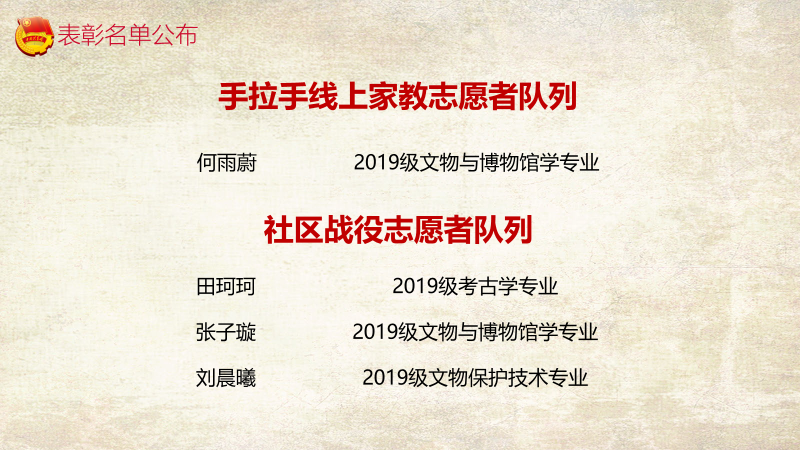 会议第三项,由主持人公布志愿者表彰名单,分别包括手拉手线上家教志愿者,社区战疫志愿者以及线上教育志愿者。