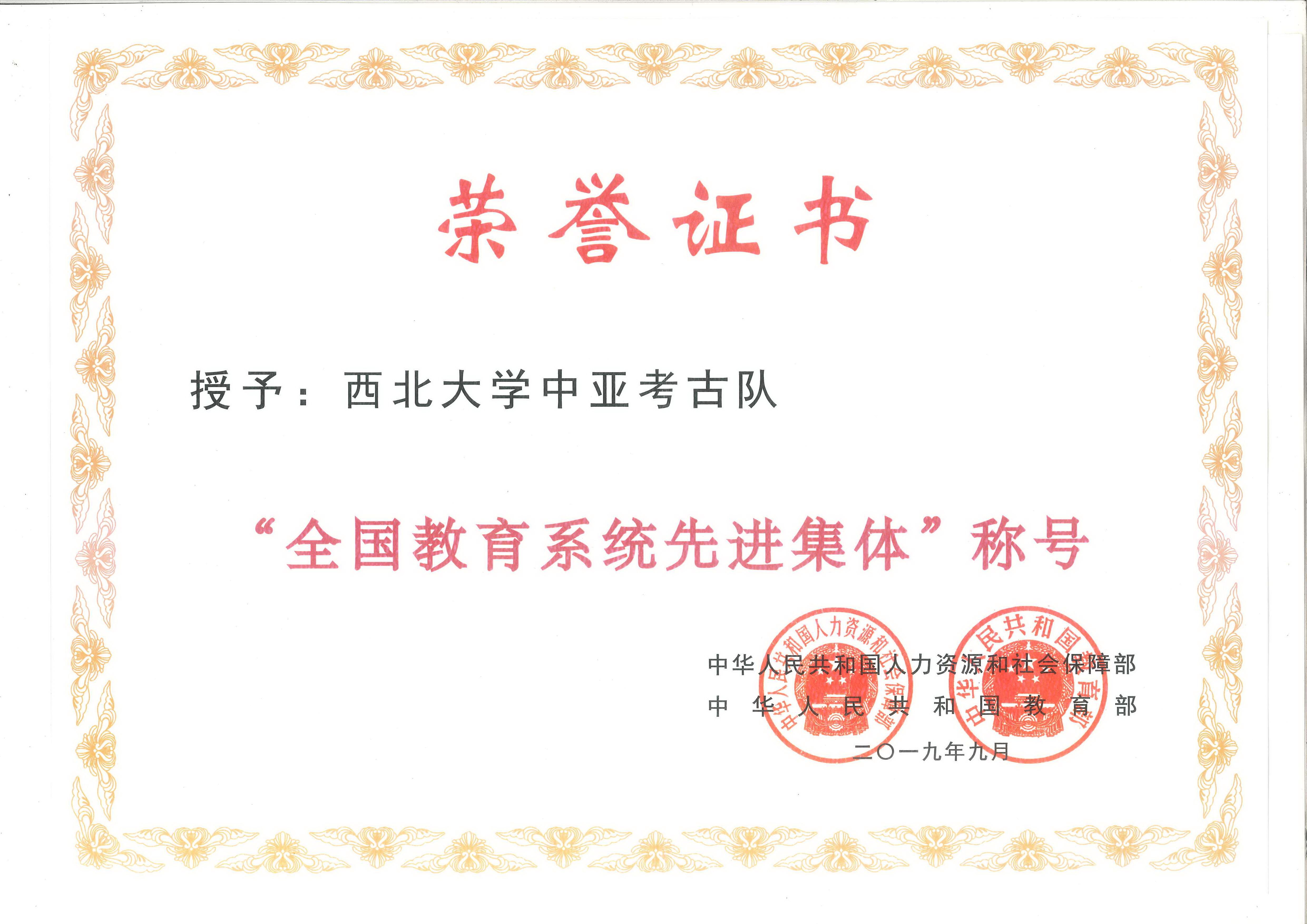 2019年教师节暨全国教育系统先进集体和先进个人表彰大会、于9月10日召开。西北大学“中亚考古队”荣获全国教育系统先进集体称号。