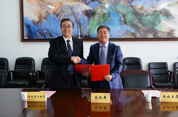 仪式第一项,陕西省文物局副局长贾强与西北大学校长郭立宏共同签订《陕西省文物局与西北大学共建西北大学文物保护修复学院框架协议书》。