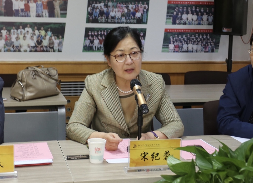大会第三项由教学委员会主任宋纪蓉教授致辞。宋教授从自己多年的工作经验出发,谈及当前我国文物保护修复人才匮乏的局面和复合型人才队伍建设的困境。从中央到地方、从故宫到高校、从北京到西安,从国内到国外,她从多方位、多角度介绍了文物保护修复人才培养工作的现状及对其发展的思考,既高屋建瓴,又落到实处,精彩之至,引发了现场嘉宾的深入思考。宋教授还指出:文物保护修复学院的成立对中国文物保护事业的发展具有里程碑意义。西北大学的文物保护学者几十年如一日在一线辛勤耕耘,实实在在做事、踏踏实实育人,为我国培养了大批优秀的文物保护人才。下一步希望大家精诚协作,以文物保护修复学院为平台,发扬敢为人先的精神,创新人才培养模式,为我国培养更多有国际视野、有国际话语权的文物保护拔尖人才。